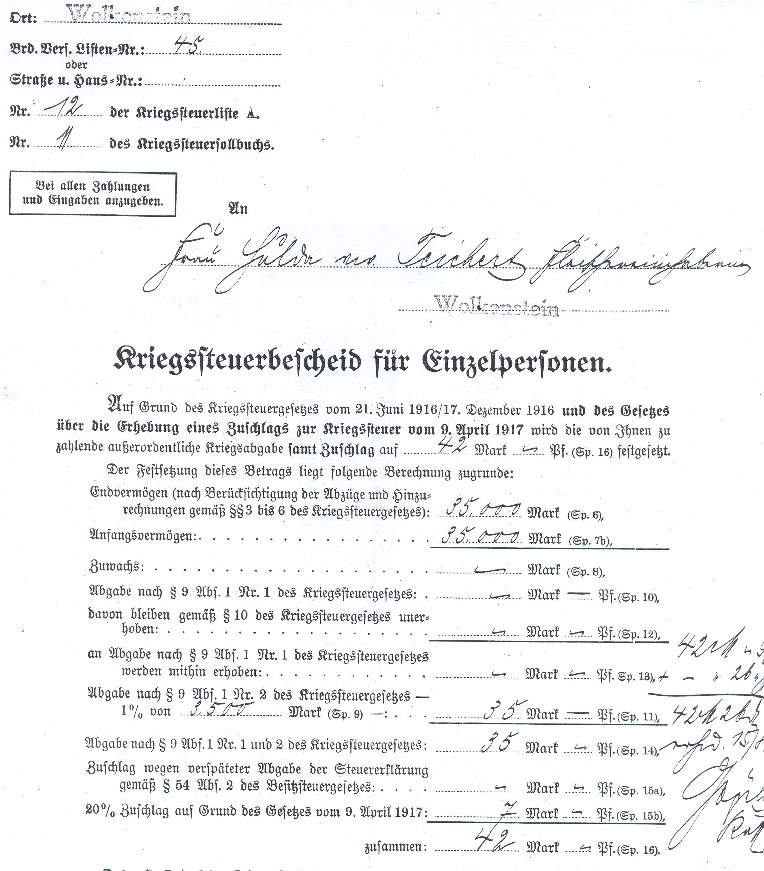 Kriegssteuerbescheid 1917 Wolkenstein 42 Mark