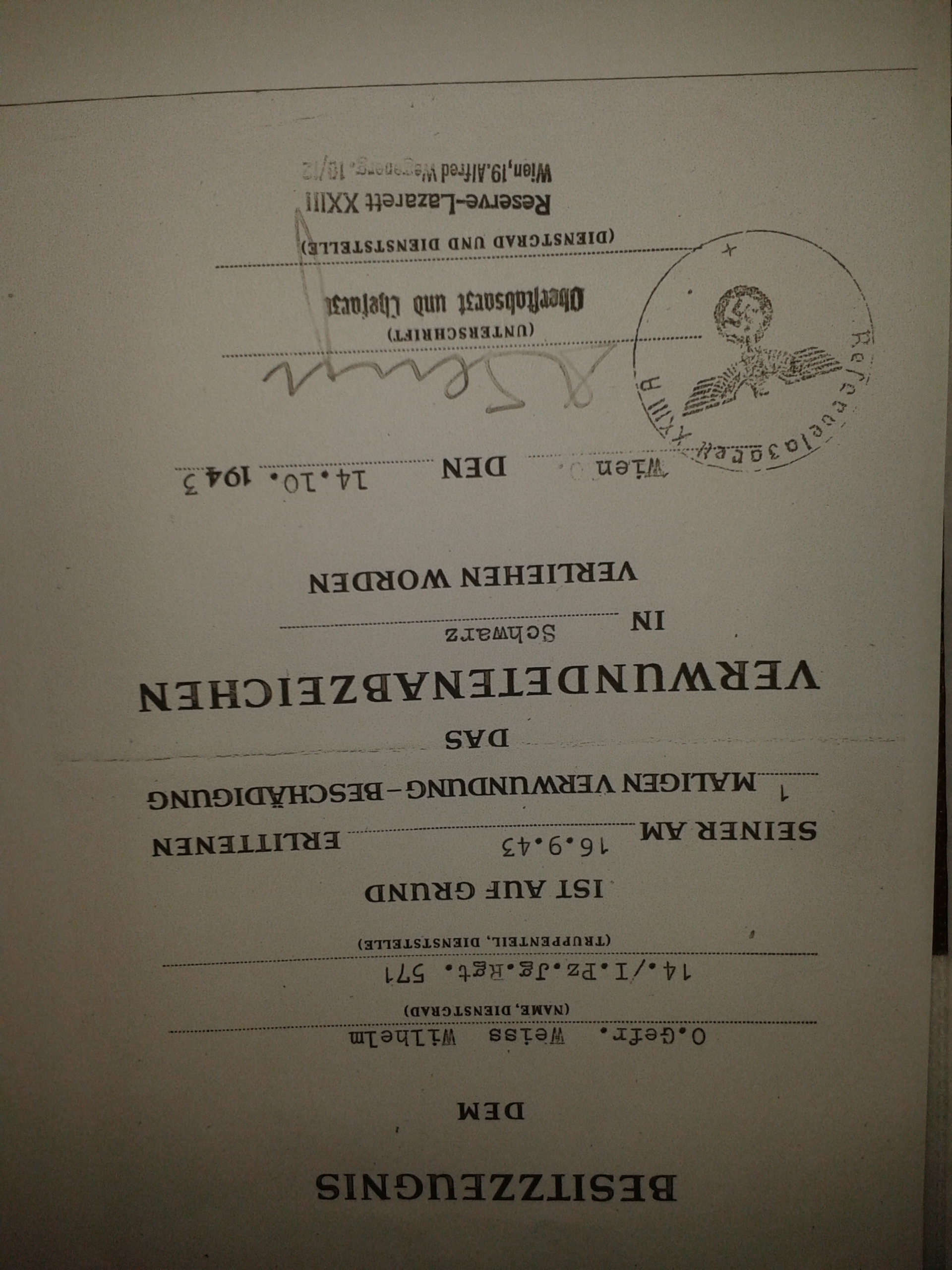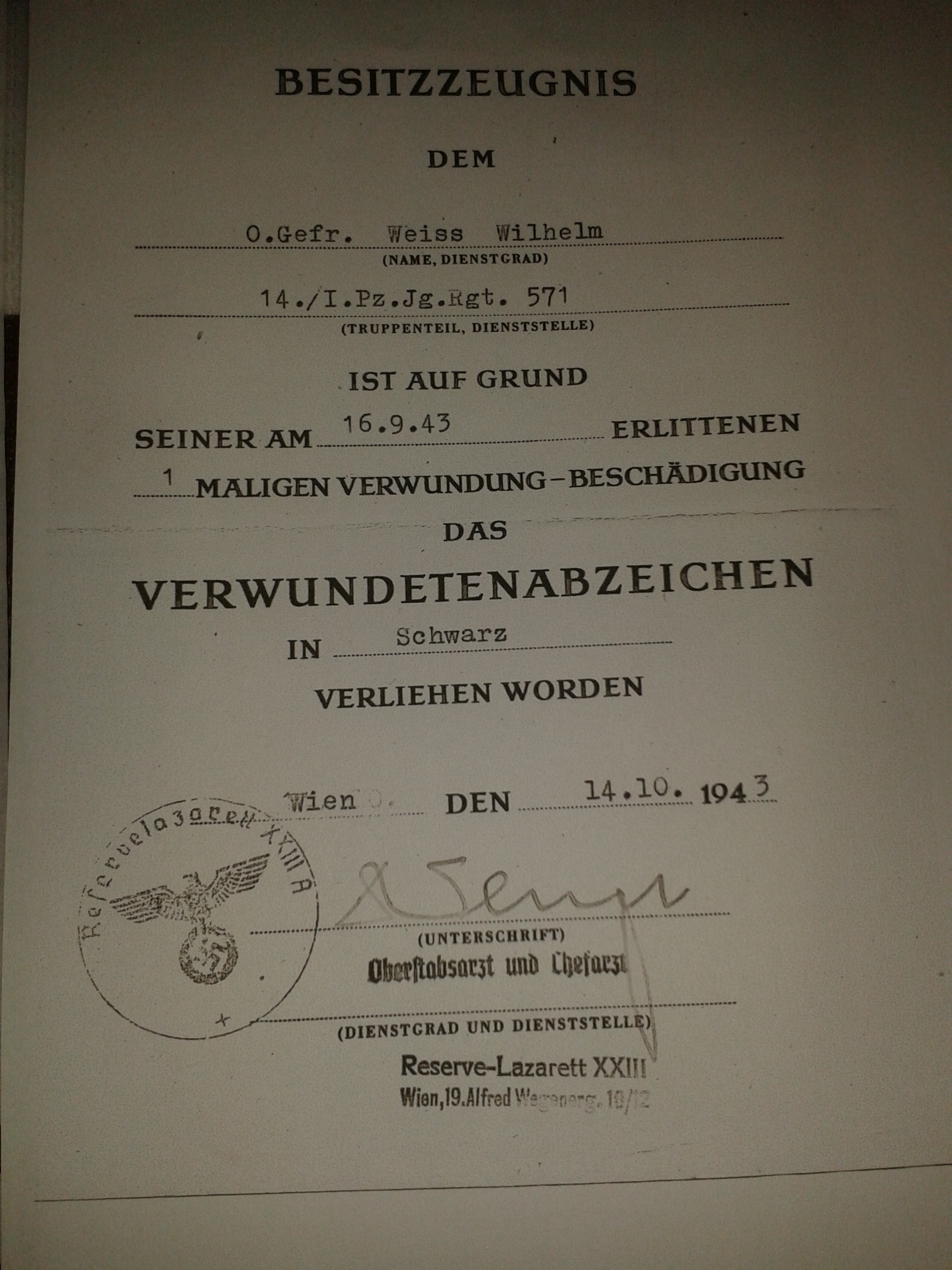 Besitzzeugnis Verwundetenabzeichen